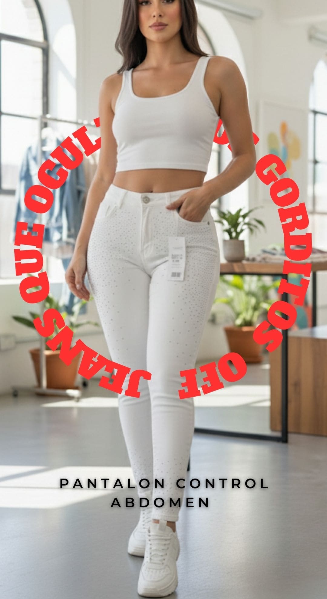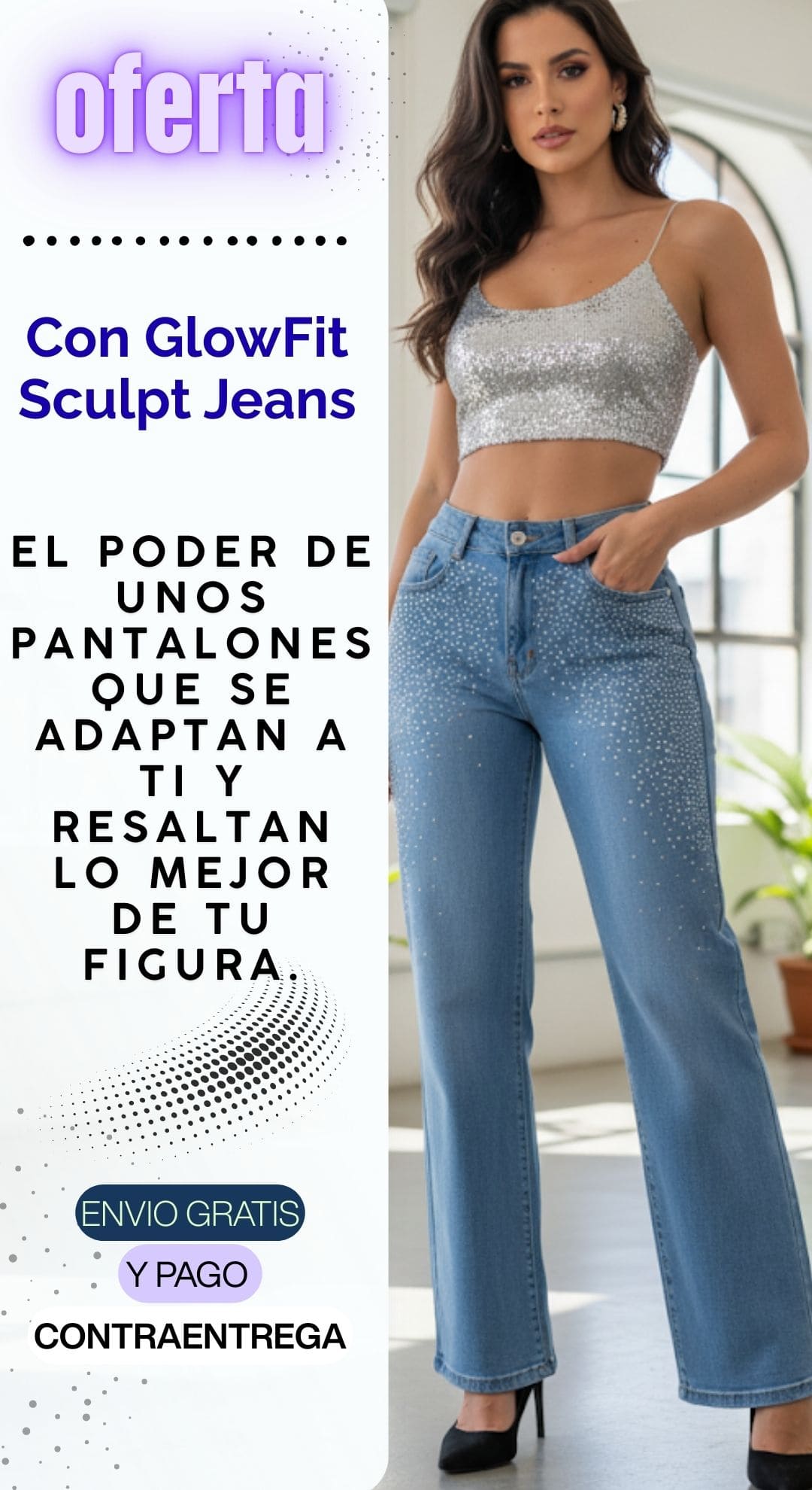 “No más gorditos con los GlowFit Sculpt Jeans, el pantalón que moldea tu figura, aplana el abdomen y realza tus curvas.