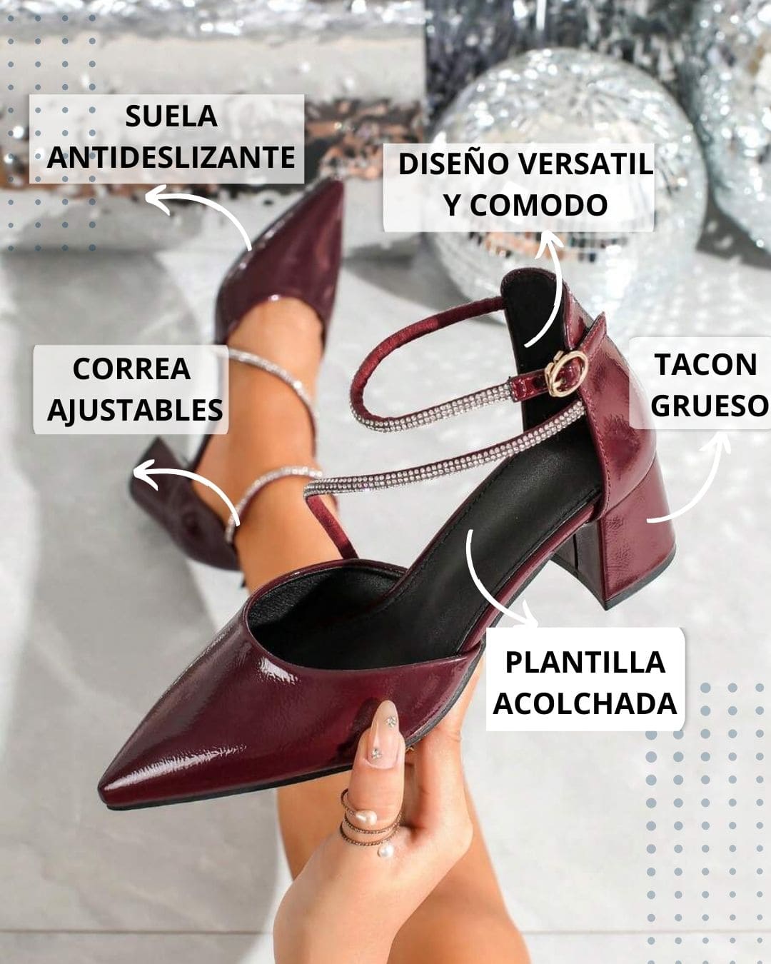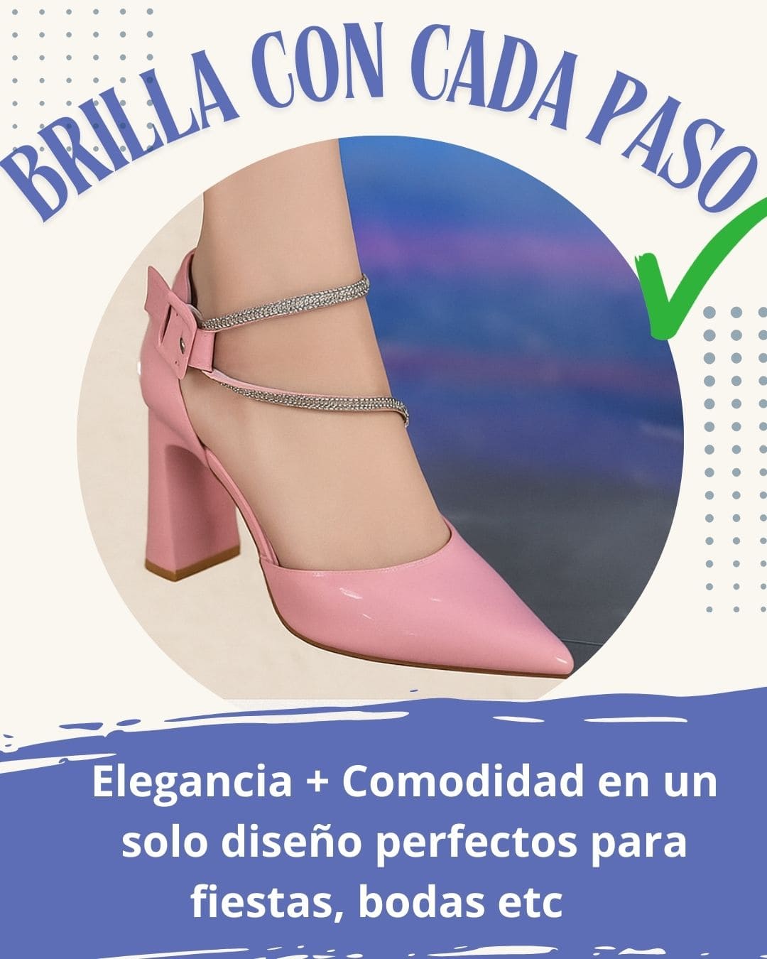 Nuestras sandalias de tacón de bloque son la combinación perfecta de moda y confort. El diseño de punta fina y las tiras con brillo no solo elevan tu look, sino que también te brindan la estabilidad que necesitas para sentirte segura en todo momento.
